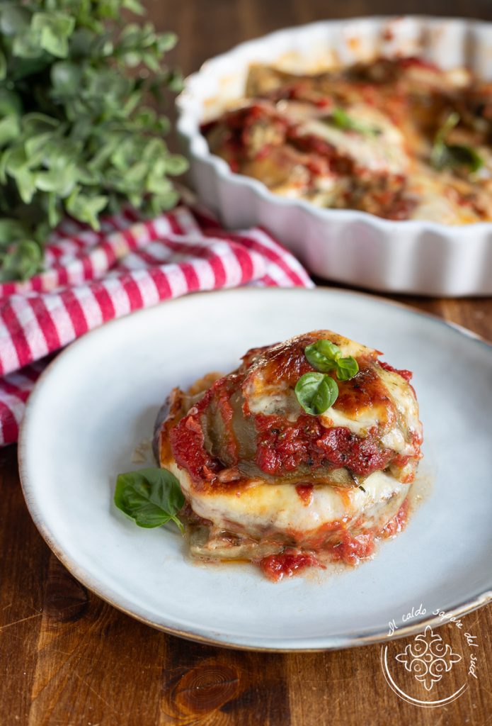 Ofen-Auberginen alla pizzaiola: drei Zutaten für ein leichtes, vegetarisches Hauptgericht, schnell, einfach und lecker. Wie die Auberginenröllchen alla pizzaiola gehört auch dieses Rezept zu unserer Sammlung schnelle Rezepte mit Auberginen, es ist einfach, preiswert und sehr schmackhaft und perfekt als Rettung fürs Abendessen, wenn man nicht weiß, was man auf den Tisch bringen soll. Die Sommerrezepte mit Auberginen sind immer beliebt, denn dieses vielseitige und günstige Gemüse erlaubt immer schmackhafte Zubereitungen mit sehr wenig Aufwand und die Auberginen alla pizzaiola mit Mozzarella und Tomate gehören voll dazu. Für dieses schmackhafte Gericht habe ich im Grunde drei Zutaten verwendet, Tomatensauce, Schmelzkäse und Auberginen; ich habe nichts frittiert, alles im Ofen gebacken und das Ergebnis war ähnlich wie bei einer Parmigiana ohne Frittieren. Ab in die Küche, bereiten wir zusammen die Auberginen aus dem Ofen mit Mozzarella und Tomate alla pizzaiola zu und ihr werdet sehen, wie lecker das ist, aber wie immer erinnere ich euch zuerst daran, dass ihr, wenn ihr über alle meine anderen Rezepte auf dem Laufenden bleiben wollt, meiner Facebook-Seite und meinem Instagram-Profil folgen könnt.