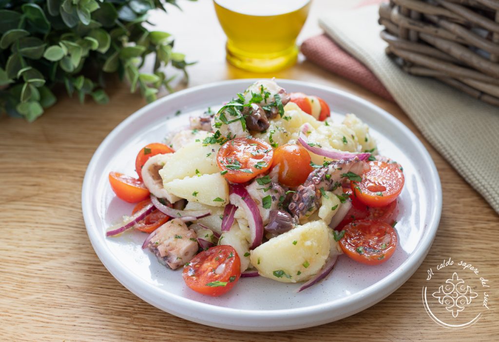 Mediterraner Oktopussalat mit Kartoffeln, dazu Cocktailtomaten, rote Zwiebeln und Oliven. Der mediterrane Oktopussalat mit Kartoffeln und Cocktailtomaten ist ein köstliches Fischhauptgericht, aber auch ein vollwertiges Hauptgericht und super einfach zuzubereiten, genau wie das Carpaccio vom Oktopus, in Zitrone mariniert. Wir alle kennen den klassischen Oktopus‑Kartoffelsalat, aber wenn wir diesem Gericht noch Cocktailtomaten, Oliven und rote Zwiebeln hinzufügen, wird es einfach großartig und ist die perfekte Idee, um ihn im Sommer auf den Tisch zu bringen. Wollt ihr den Oktopussalat mit Kartoffeln auf mediterrane Art auch ausprobieren? Ab in die Küche — aber wie immer erinnere ich euch: Wenn ihr über meine Rezepte auf dem Laufenden bleiben wollt, folgt meiner Facebook‑Seite (hier) und meinem Instagram‑Profil (hier).