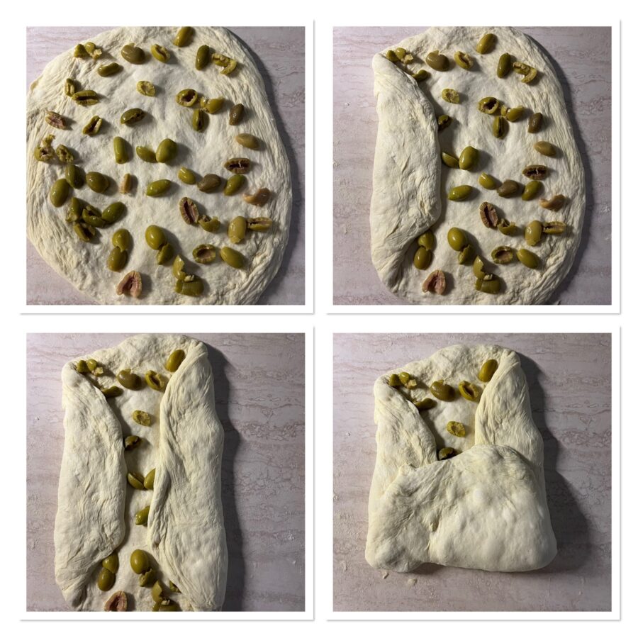 • Füllt die Scheiben mit Oliven, faltet dann die Seiten ein und schließlich wie eine Brieftasche zusammen.