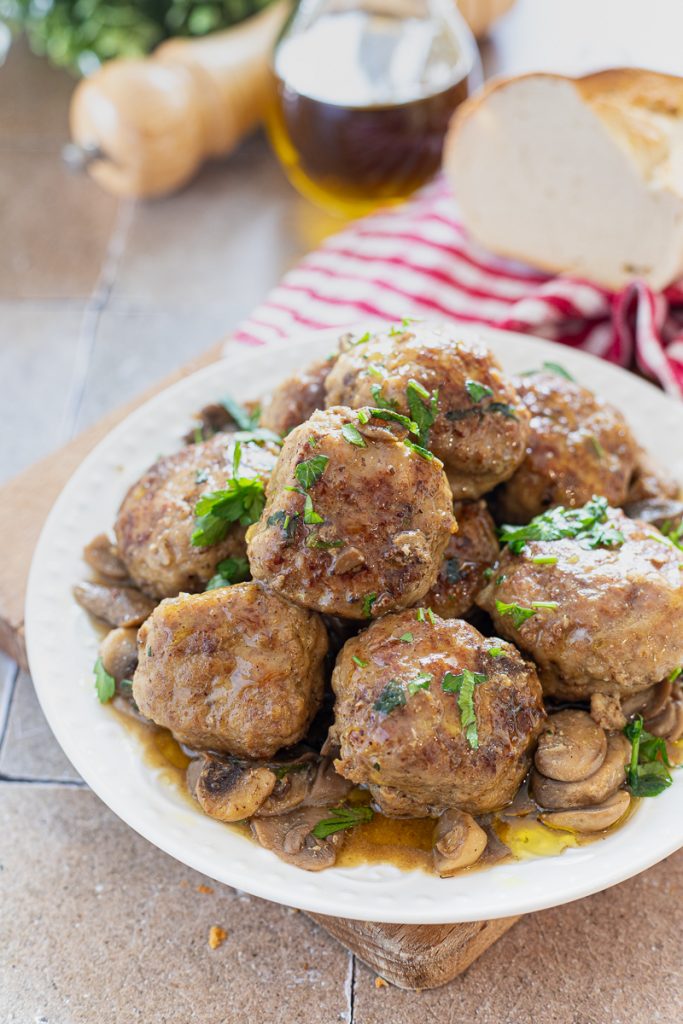 Mit meinem Basisrezept für Fleischbällchen sind diese typischen Omas Hackbällchen mit gebratenen Pilzen besonders saftig, dank des eingeweichten altbackenen Brots, das dem Teig beigemischt wird. Dieser Bestandteil zusammen mit Eiern, Hackfleisch, Parmesan und wenig anderem ergibt ein tolles Hauptgericht, bereichert durch den typischen Geschmack der Pilze! Ich habe gewöhnliche Champignons verwendet, ihr könnt aber auch andere Pilzsorten, frisch oder tiefgefroren nehmen – vielleicht Steinpilze – dann wird das eines der leckersten Rezepte, um Hackbällchen zuzubereiten, die ihr je probieren werdet.