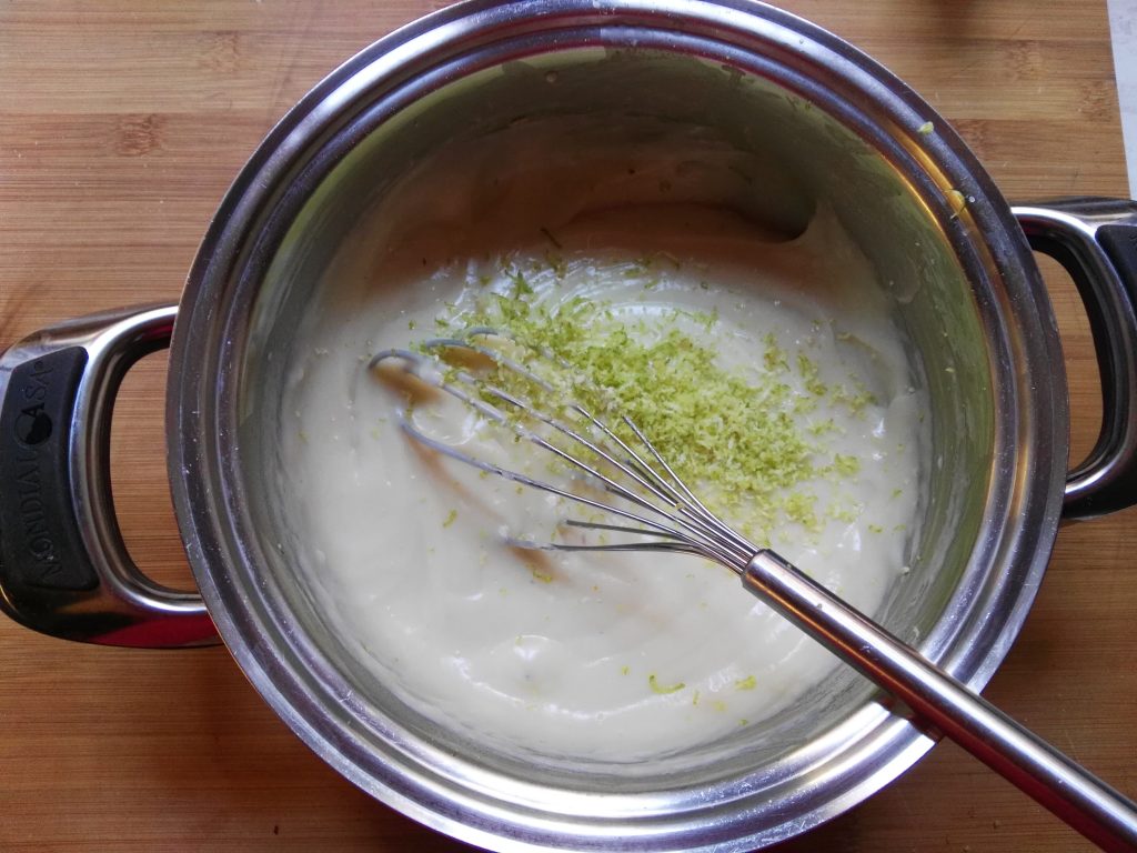 Die Creme unter ständigem Rühren mit dem Schneebesen auf dem Herd eindicken lassen, den Herd ausschalten und die Schüssel vom Herd nehmen. Außerhalb der Hitze die geriebene Zitronenschale einer Zitrone unterrühren. Die Creme in eine Glasschüssel füllen und abgedeckt mit Frischhaltefolie abkühlen lassen.