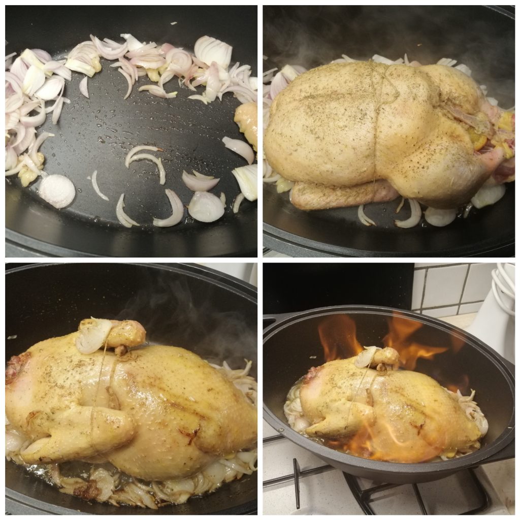 Legt die Ente in den Topf, bratet sie rundherum an und löscht mit Brandy ab. Sobald ihr den Alkohol riecht, flammt ihn ab — also Feuerzeug heran und anzünden; nachdem der Alkohol verbrannt ist, erlischt die Flamme von selbst (wenn ihr das nicht machen wollt, könnt ihr diesen Schritt weglassen).