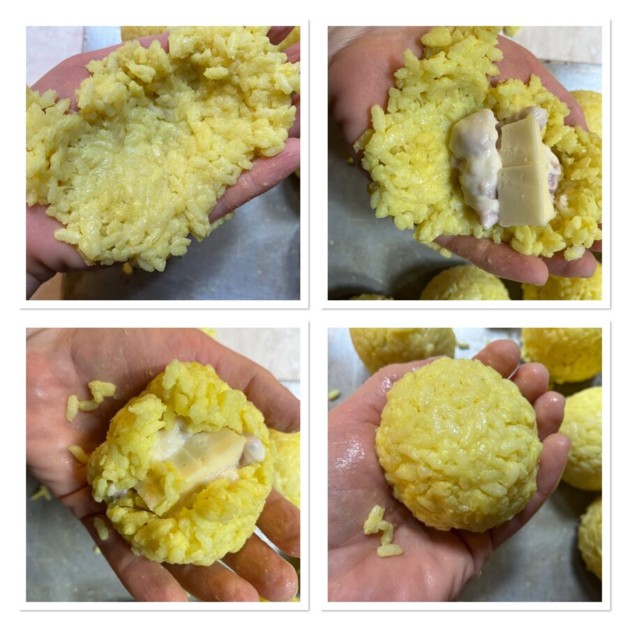 Formen Sie die Arancina so, dass eine Reiskugel mit der Füllung im Inneren entsteht, und fahren Sie so fort, bis der gesamte Reis verarbeitet ist.