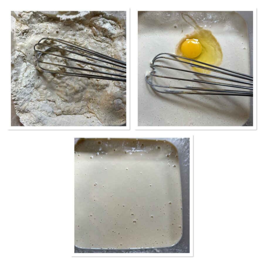 • Bereiten Sie den Teig vor, indem Sie das Mehl mit wenig Wasser glatt rühren; sobald keine Klümpchen mehr vorhanden sind, fügen Sie ein Ei, den restlichen Teil des Wassers hinzu und verrühren alles mit dem Schneebesen.