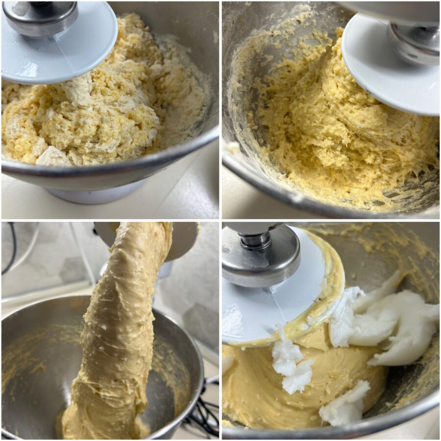 Gebt nun das Schmalz nach und nach hinzu, lasst es vollständig aufnehmen, bevor ihr mehr zugebt, und fügt das Salz erst ganz zum Schluss hinzu.