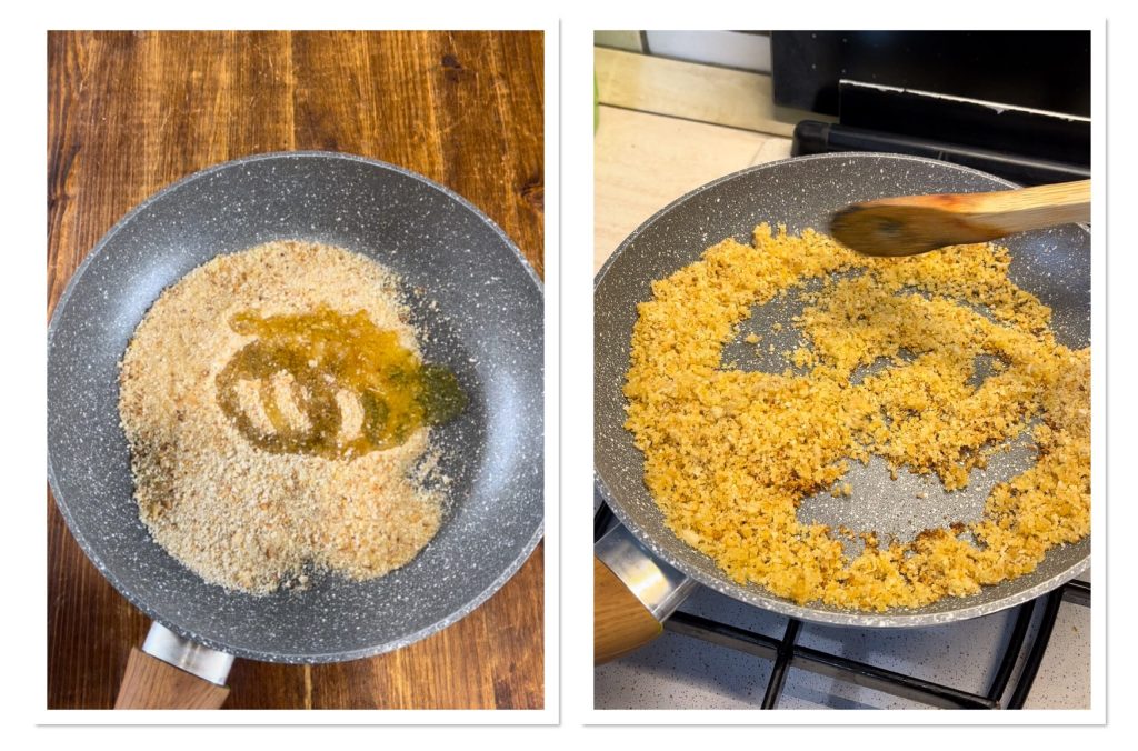 Gib die Semmelbrösel in eine Pfanne, gib einen guten Schuss Olivenöl dazu und röste sie bei starker Hitze, dabei öfter umrühren und darauf achten, dass sie nicht verbrennen. Sobald sie eine goldbraune Farbe haben, ist die sogenannte „muddica atturrata“ fertig.