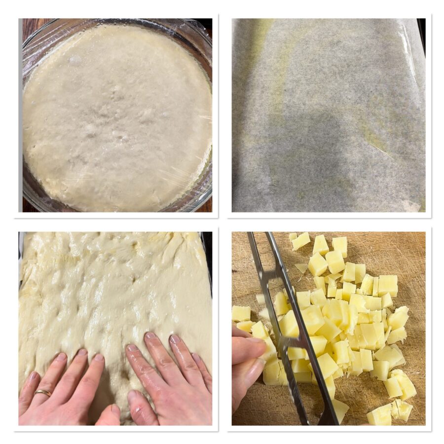 Sobald der Teig sein Volumen verdoppelt hat, lege ein Backblech mit Backpapier aus, fette es großzügig mit Öl ein und stürze den Teig darauf.