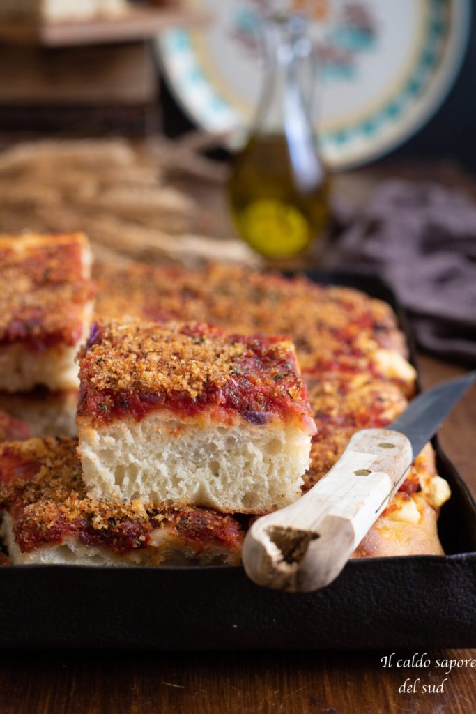 Das Sfincione ist fertig. Wenn möglich, iss es noch am selben Tag; verbliebene Stücke solltest du mit Frischhaltefolie abdecken, bei Raumtemperatur aufbewahren und innerhalb von 24 Stunden verzehren.