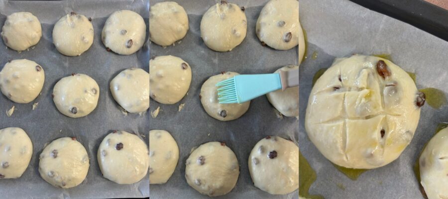• Bestreicht die Brötchen mit Olivenöl, ritzt sie mit zwei horizontalen und zwei vertikalen Schnitten im Gittermuster – so entsteht eine kreuzähnliche Form – und backt sie in einem vorgeheizten Ofen bei 200°C (Ober/Unterhitze) für ca. 20 Minuten.