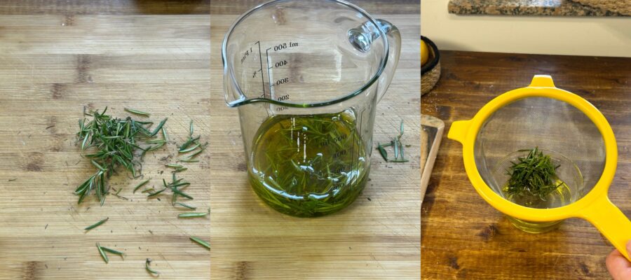 • Zupft die Nadeln des Rosmarins vom Zweig, gebt sie in ein hitzebeständiges Glas und fügt das Öl hinzu. Erhitzt das Ganze 5 Minuten bei 250 W in der Mikrowelle oder 10 Minuten bei sehr niedriger Hitze auf dem Herd. Das Öl sollte nicht braten, sondern nur den Duft des Rosmarins aufnehmen. Nach der Erhitzung abkühlen lassen und durch ein Sieb filtern.