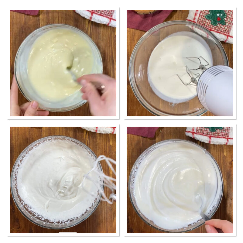 Schlagt die kalte Sahne in einer kalten Schüssel steif, hebt die mit Mascarpone vermischte weiße Schokolade unter und verrührt alles.