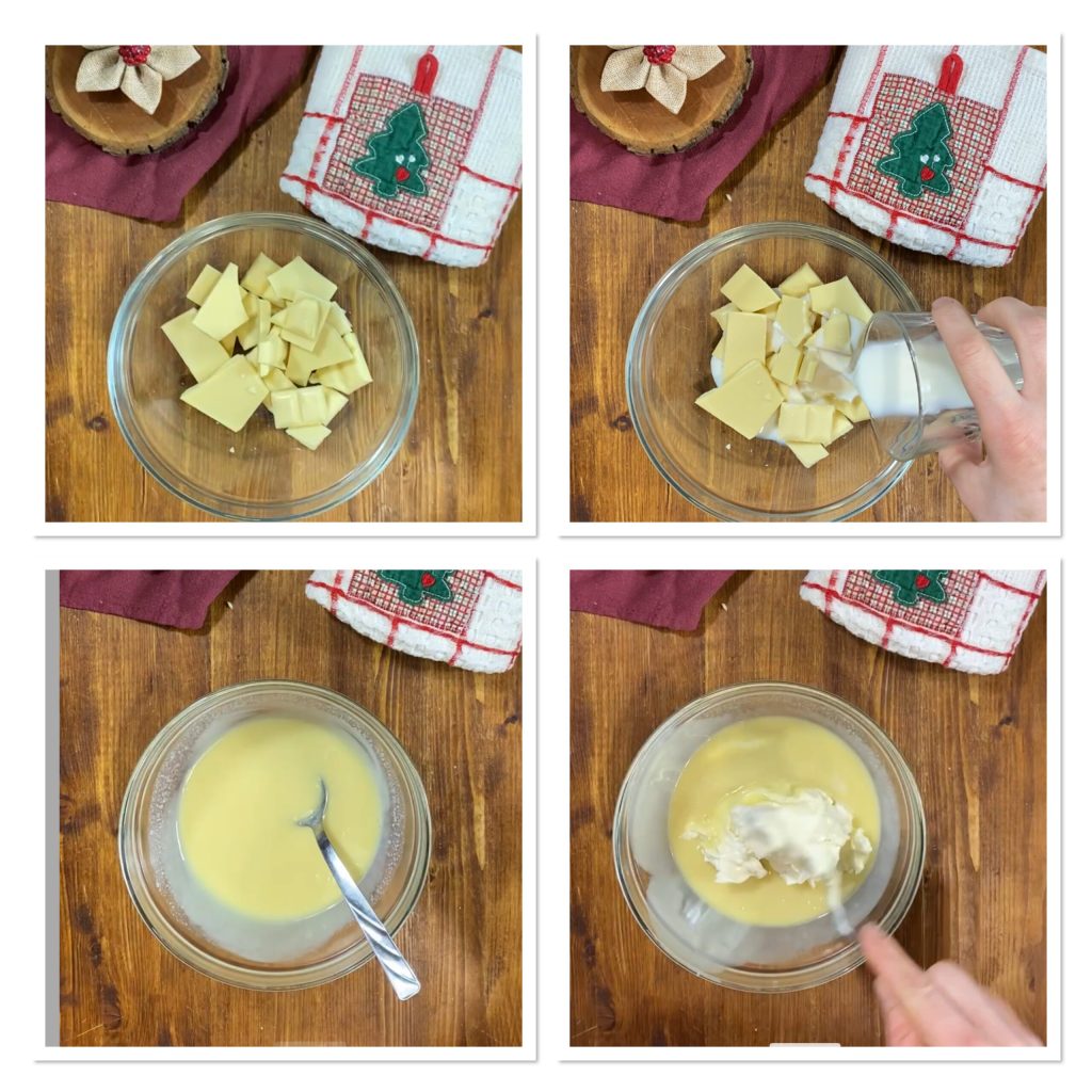 Um euer Pandoro-Zuccotto mit Kaffee vorzubereiten, schneidet die weiße Schokolade in Stücke, gebt sie in eine Schüssel, fügt die Milch hinzu und erwärmt alles für ein paar Sekunden in der Mikrowelle (oder im Wasserbad) und rührt, bis alles geschmolzen ist.