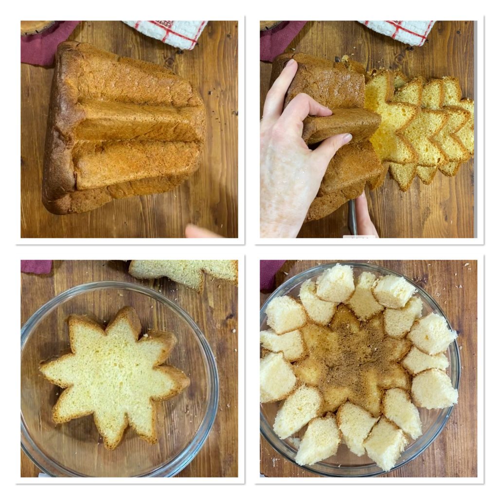 Schneidet den Pandoro in Scheiben von etwa 1 cm oder etwas dicker und legt die erste Scheibe auf den Boden der Schüssel oder Form, die ihr verwendet.