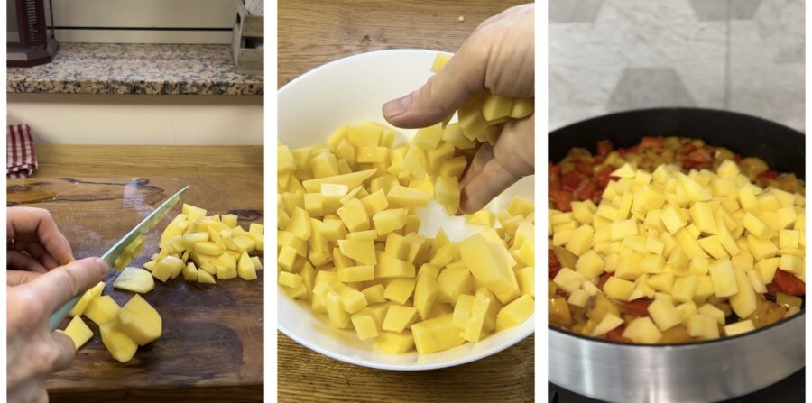 Kartoffeln waschen, schälen und in kleine Würfel schneiden, zu den Paprika geben und bei starker Hitze anbraten,