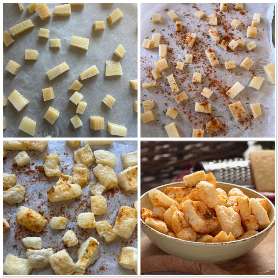 Die verbleibende Feuchtigkeit in den Rinden verwandelt sich in Dampf, wodurch sich im Inneren Blasen bilden, die sie aufblähen. Gleichzeitig schmelzen die Käsefette und trocknen dann wieder – so werden sie leicht, knusprig und unwiderstehlich.