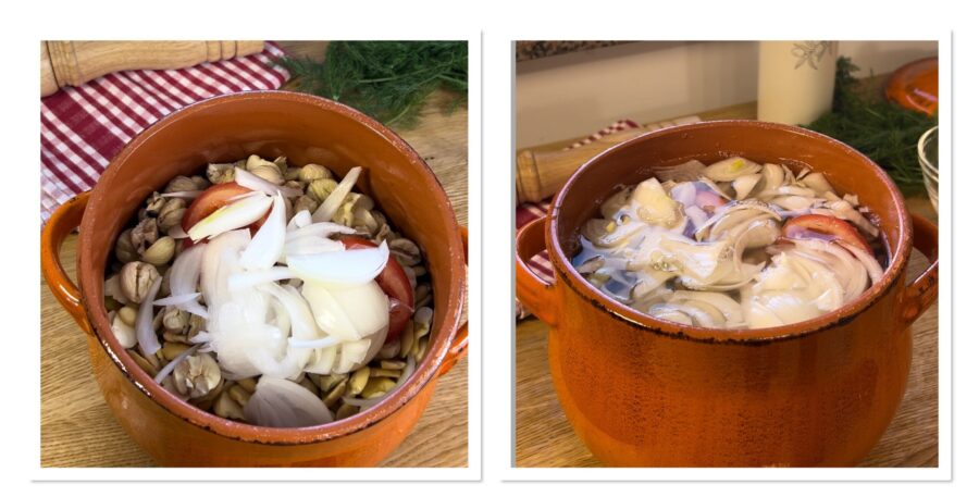 Spült die getrockneten Saubohnen mehrmals und gebt sie dann in eine große Schüssel. Bedeckt sie mit kaltem Wasser und lasst sie mindestens 12 Stunden quellen. Auf dieselbe Weise die Kastanien einweichen und ebenfalls mindestens 12 Stunden rehydrieren lassen. Am nächsten Morgen haben sich sowohl die Saubohnen als auch die Kastanien etwa verdoppelt; gießt beides ab und entfernt bei den Kastanien die kleinen Hautreste, die sich in den Falten festgesetzt haben. Gebt alles in einen Tontopf oder einen Gusseisentopf oder in einen Topf mit dickem Boden.