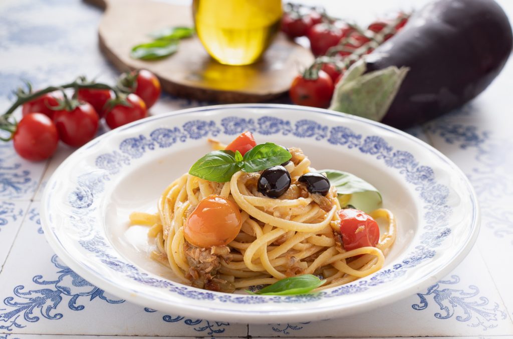 Zutaten für Pasta mit Auberginen, Thunfisch und Kirschtomaten