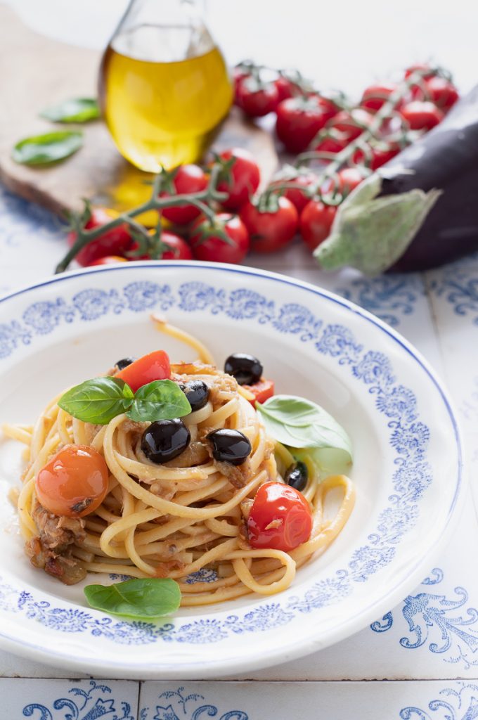 So machst du Pasta mit Auberginen, Thunfisch und Kirschtomaten