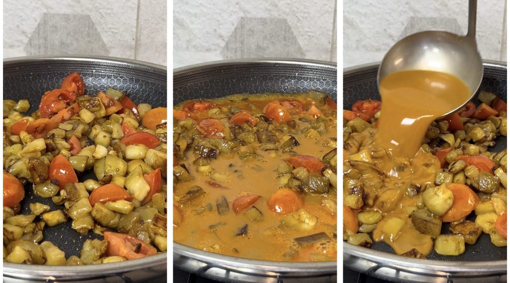 Bratet eine Knoblauchzehe mit reichlich Olivenöl an, gebt die Auberginenwürfel dazu und kocht bei mittlerer Hitze, dabei häufig umrühren, bis die Auberginen weich und goldbraun sind. Setzt das Wasser für die Pasta auf und beginnt mit der Zubereitung.