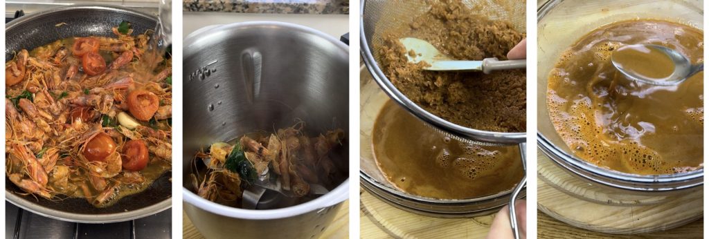 Beginnen wir mit der Zubereitung der Garnelen-Bisque. Spült die Garnelen, lasst sie abtropfen und entfernt Kopf und Panzer. Mit Hilfe eines Zahnstochers könnt ihr, wenn ihr möchtet, den Darm entfernen. Legt die Garnelen beiseite, ihr werdet sie später brauchen, und wenden wir uns der Bisque zu.