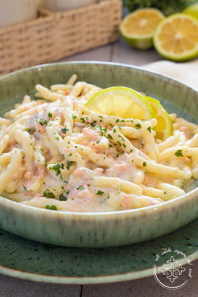 Cremige Pasta mit geräuchertem Lachs und Zitrone, super einfach und schnell gemacht. Ich liebe Rezepte mit geräuchertem Lachs, egal ob eine geräucherte Lachs-Mousse, eine kalte Pasta mit Zucchini und Lachs oder einfache Zucchiniröllchen mit Robiola und Lachs – ich kann zu geräuchertem Lachs einfach nie Nein sagen! Vor ein paar Tagen gab es ihn im Angebot im Supermarkt, also habe ich mehrere Packungen mitgenommen: Mit einer Packung habe ich die Pasta mit Lachs und Tomaten gemacht, dann gab’s Avocado-Toast mit geräuchertem Lachs auf Bauernbrot und zuletzt eine Omelette-Rolle mit Lachs und Rucola. Aus der letzten Packung habe ich dann eines der Lieblingsgerichte meines Sohnes gemacht: Pasta mit Lachs, Sahne und Zitrone. Für dieses Gericht habe ich frische Pasta gewählt, besonders Trofie, wegen der Konsistenz, aber ihr könnt natürlich jede Form wählen – Busiate, Maccheroni oder auch normale trockene Pasta.