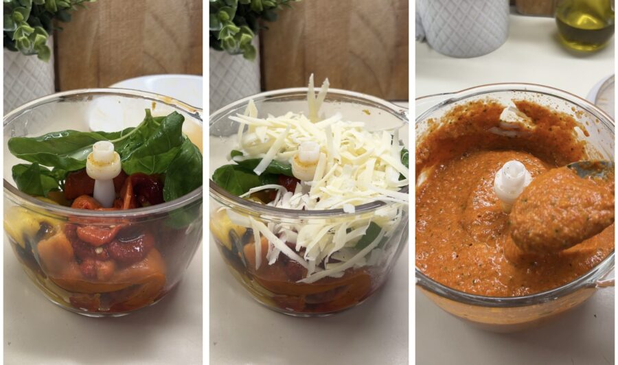 Für dieses Rezept benötigen Sie geröstete Paprika; Sie können sie im Ofen oder in der Heißluftfritteuse zubereiten. Um sie im Ofen zu rösten, schalten Sie den Grill ein, legen Sie das Gemüse auf ein niedrigeres Backblech, vorzugsweise mit Backpapier ausgelegt, und positionieren Sie es eine Stufe niedriger als die höchste Einstellung des Ofens. Sobald die Haut angebräunt ist, drehen Sie die Paprika und sorgen Sie dafür, dass sie gleichmäßig von allen Seiten garen – stechen Sie sie nicht an. Wenn die Paprika gleichmäßig gar sind (das dauert etwa 35–40 Minuten), geben Sie sie vorsichtig in eine Schüssel, decken sie ab und lassen sie mindestens 20–25 Minuten ruhen.