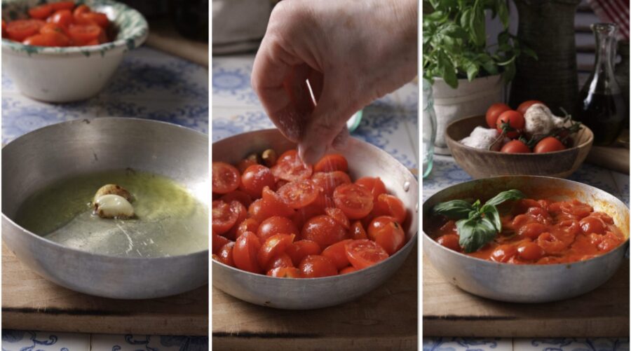 Spült die Kirschtomaten ab – je süßer sie sind, desto besser wird die Sauce, also wählt gute Tomaten. Halbiert sie und legt sie kurz beiseite. Den Knoblauch schälen, in eine Pfanne geben, reichlich Öl dazugeben und den Knoblauch leicht anbraten, bis er Farbe nimmt, aber nicht verbrennt (dann würde er bitter). Die Kirschtomaten hinzufügen,