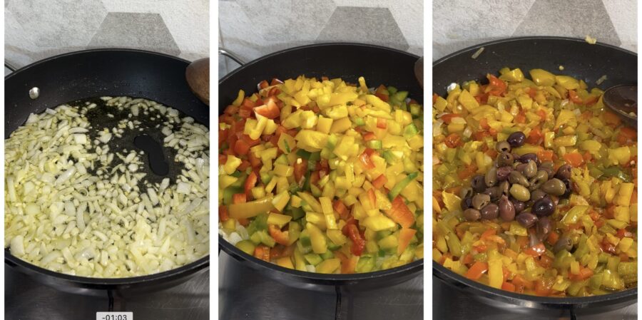Paprika hinzufügen, salzen und bei starker Hitze braten, bis sie zusammenfallen und gut Aroma entwickelt haben. Wenn sie gar sind, die Oliven dazugeben,