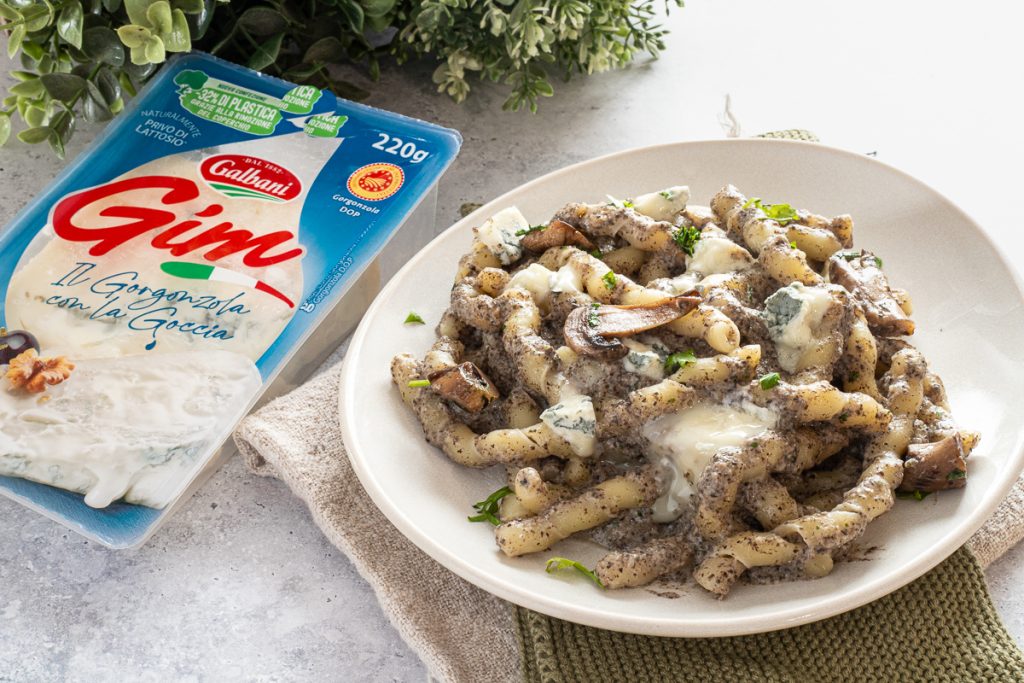 Koche die Pasta und gieße sie al dente ab, gib sie dann zur Pilzcreme in die Pfanne zusammen mit etwas Kochwasser und rühre bei starker Hitze, bis die Pasta vollständig von der Creme umhüllt ist. Sofort anrichten und mit Würfeln von Gorgonzola D.O.P. servieren, die durch die Hitze der Pasta schmelzen.