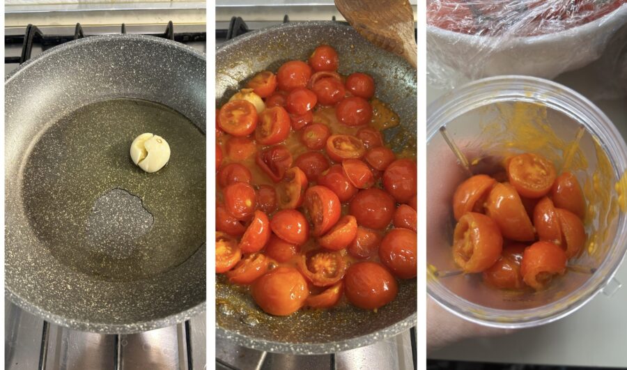 • Für die cremige Pasta mit Räucherlachs und Kirschtomaten etwas Öl erhitzen und den Knoblauch darin aromatisieren. Gebt die Kirschtomaten dazu, salzt und lasst sie weich werden. Sobald sie weich sind, nehmt etwa zwei Drittel davon und gebt sie in den Mixer; püriert sie, bis eine gleichmäßige Sauce entstanden ist.
