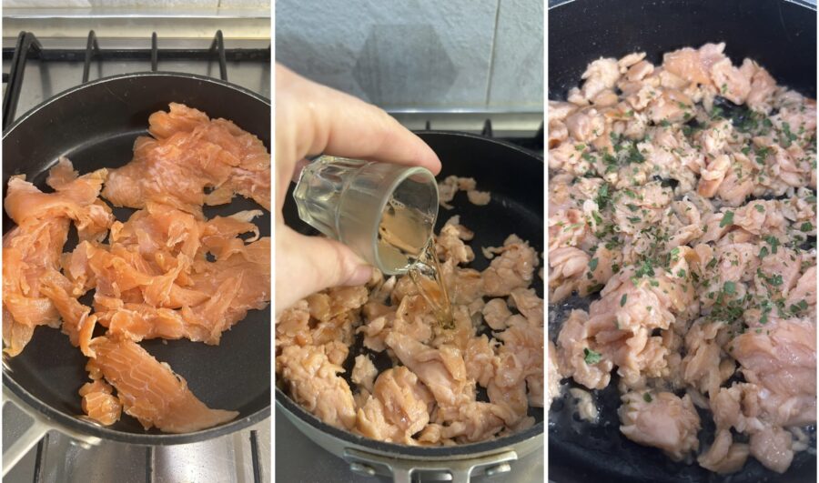 • Erhitzt eine weitere Pfanne, gebt den in Stücke gezupften Räucherlachs hinein und rührt kurz, damit er etwas zerfällt. Löscht mit Brandy, Grappa oder Wein ab, lasst den Alkohol verdampfen, nehmt die Pfanne vom Herd und streut ein wenig Petersilie darüber.