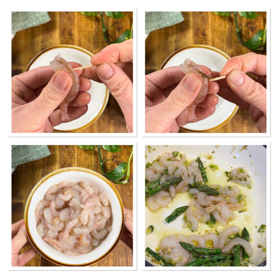 • Gebt die Spargelspitzen dazu, lasst sie etwa 4 Minuten mitgaren und fügt dann die Garnelen hinzu, die ihr bereits geschält, entdarmt, unter kaltem Wasser abgespült und abgetropft habt.