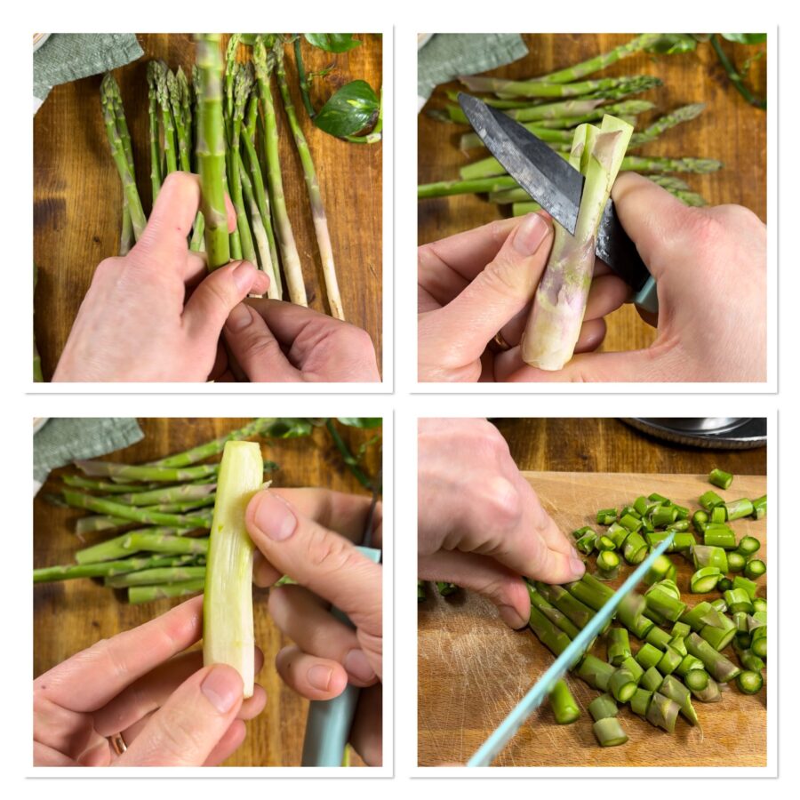 • Für die Pasta mit Spargel und Garnelen beginnt ihr mit dem Putzen des Spargels: schneidet das harte Ende ab, indem ihr ihn an der Stelle bricht, an der er weicher wird. Die besonders harte und faserige Basis könnt ihr schälen und etwa zwei Zentimeter am unteren Ende entfernen, da diese sonst bitter schmecken könnten. Schneidet den Spargel in Scheiben und legt die Spitzen beiseite.
