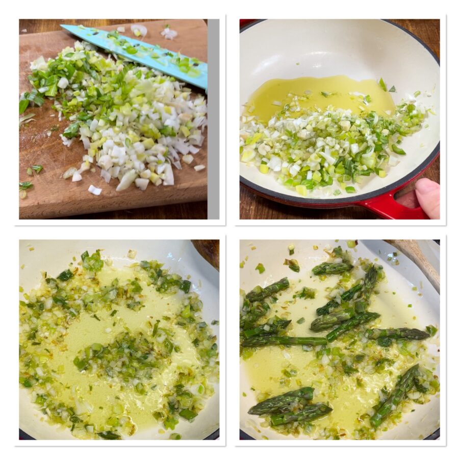 • Schält und hackt die Frühlingszwiebeln fein, schwitzt sie in etwas gutem Olivenöl an und lasst sie weich werden. Bringt in der Zwischenzeit das Pastawasser zum Kochen.