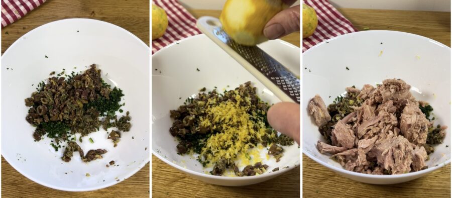 Gebt alles in eine Schüssel und fügt die abgeriebene Schale einer Bio-Zitrone, einen Esslöffel Zitronensaft und den abgetropften Thunfisch hinzu,