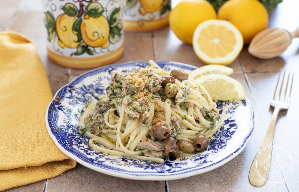 Pasta mit Thunfisch, Oliven und Kapern, ganz ohne Tomatensauce, eine kalte Sauce, die du in 5 Minuten zubereitest und die Pasta ist sofort zum Genießen fertig. Das Gericht gehört zu den schnellen und günstigen Hauptgerichten, die uns immer weiterhelfen, zu den günstigen Rezepten fürs Abendessen, die uns aus der Patsche helfen, und zu den schnellen und raffinierten Hauptgerichten, die man irgendwann einfach braucht! Die Pasta mit Thunfisch, Oliven und Kapern wird roh zubereitet, außer der Pasta wird nichts gekocht, und sie hat ein unglaublich gutes Aroma — mit einem Hauch gerösteter Semmelbrösel (muddica atturrata) wird sie sogar außergewöhnlich! Ab in die Küche: bereiten wir dieses Gericht zusammen zu, das zu jeder Jahreszeit passt; es schmeckt wirklich toll. Wenn ihr auf dem Laufenden bleiben wollt, könnt ihr meiner Facebook-Seite und meinem Instagram-Profil folgen.