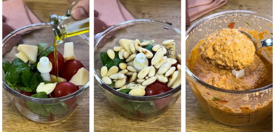 Das Rezept für das Pesto aus Trapani bzw. das Pesto für die PASTA CU‘ L’AGGHIA PISTATA sieht vor, dass viel Knoblauch verwendet wird, der traditionell im Mörser zerstoßen wird (agghia pistata) – ich persönlich verwende jedoch tatsächlich nur eine Knoblauchzehe und arbeite aus Praktikabilitätsgründen mit dem Mixer.