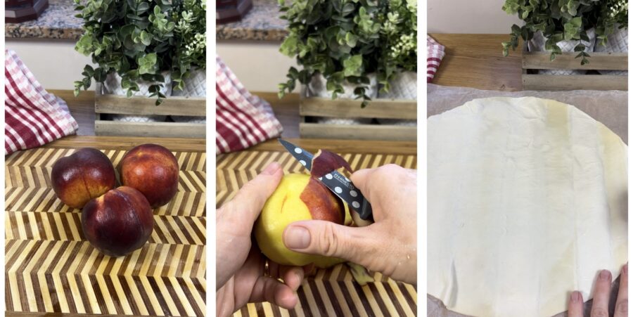 Für die Pfirsich-Blätterteigspalten wählt ihr reife, aber nicht zu weiche Pfirsiche; schält und schneidet sie in Scheiben. Rollt den Blätterteig aus.