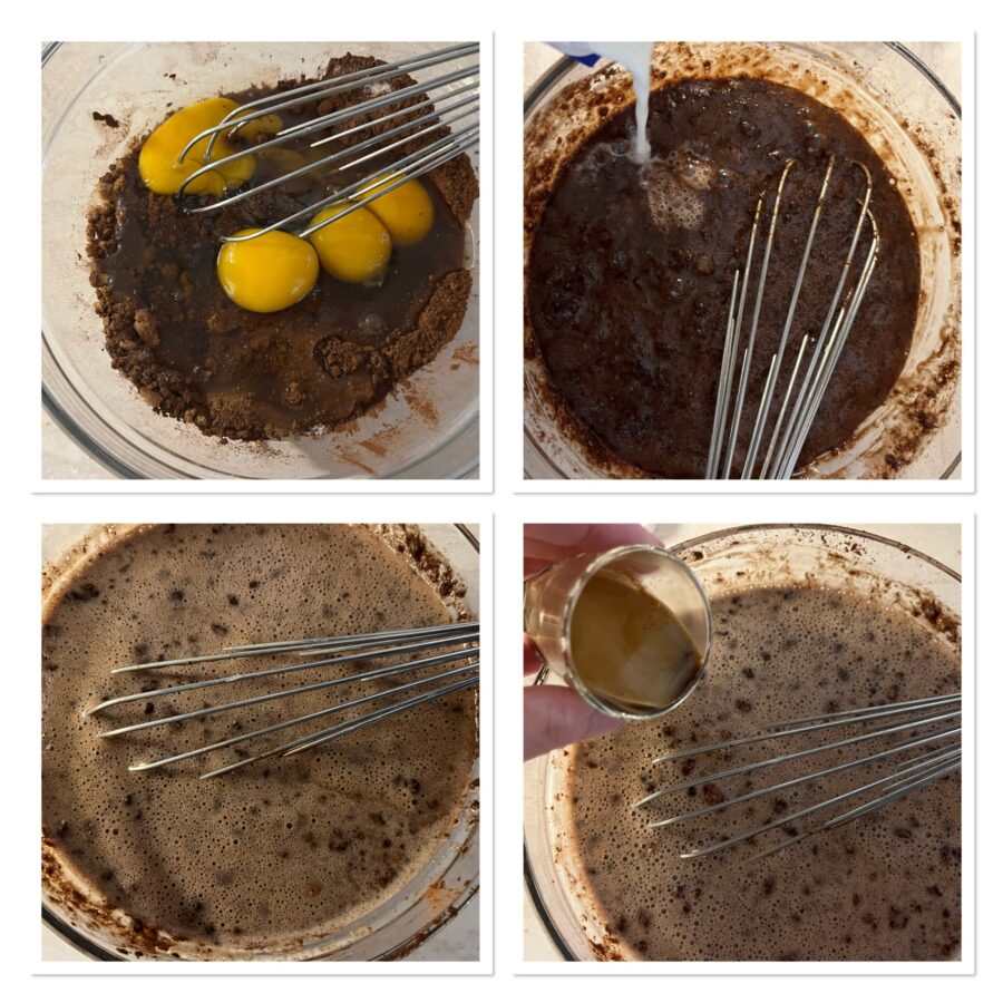 Vermischt alles, gebt die Eier dazu und verrührt vorsichtig mit dem Schneebesen, dann gießt ihr die Milch nach und nach dazu. Gebt den Espresso und den Rum hinzu und rührt alles glatt.