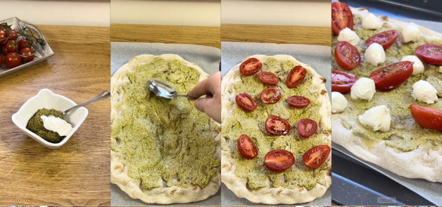 Schritte zur Zubereitung der Pinsa mit Pesto und Kirschtomaten