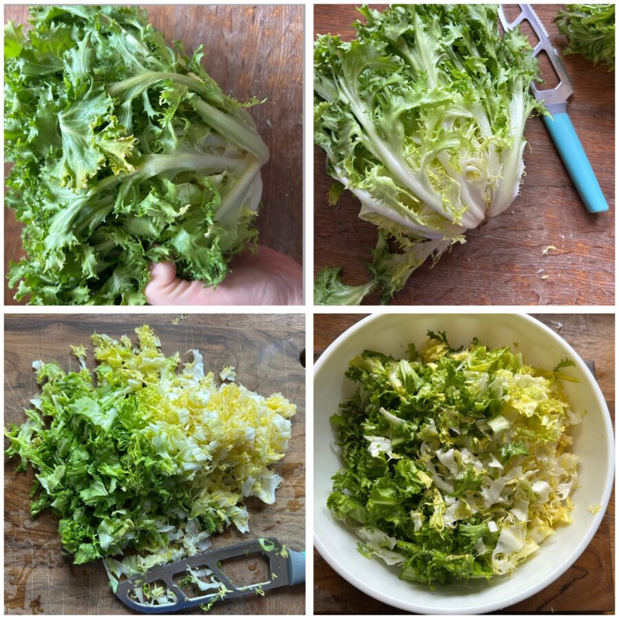 • Für die Füllung der Pitoni von Messina putzen Sie die krause Endivie, entfernen die äußeren, härteren Blätter, waschen sie gründlich und lassen sie gut abtropfen. Schneiden Sie die Endivie fein und geben Sie sie in eine große Schüssel.