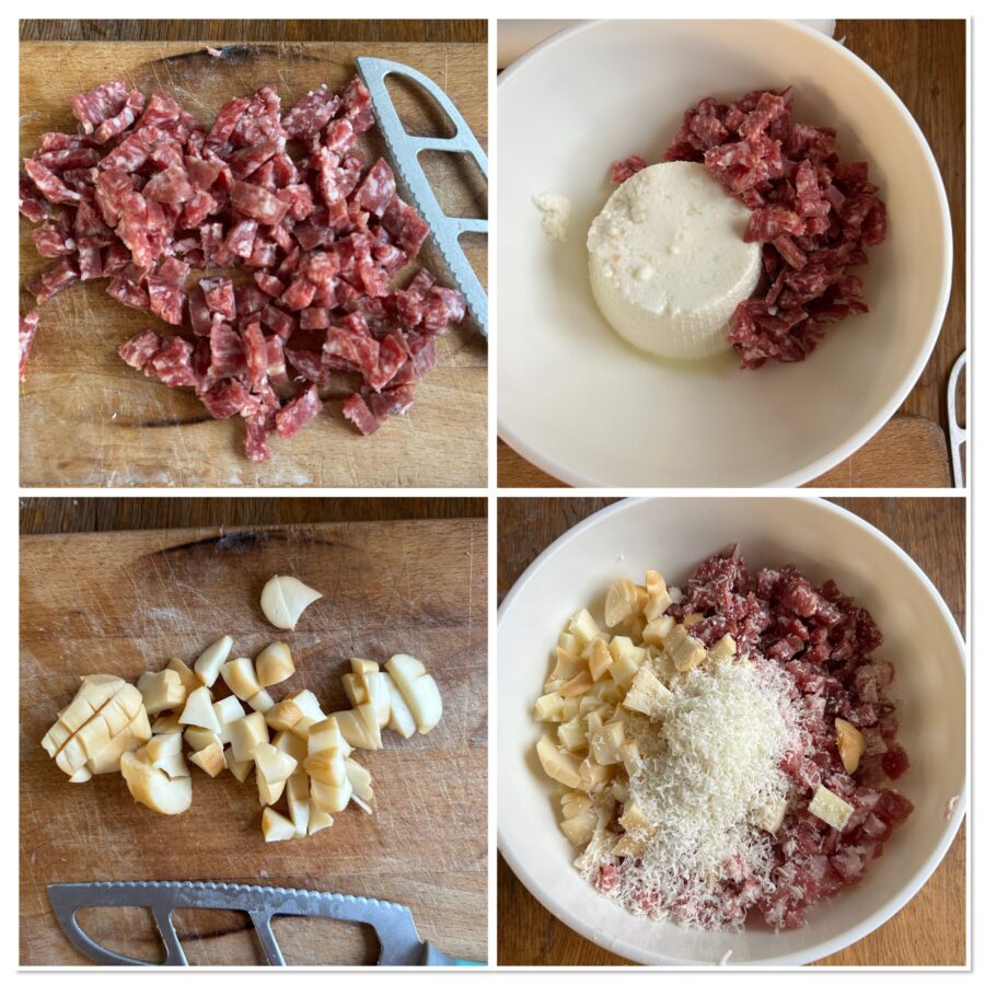 In der Zwischenzeit die Füllung vorbereiten: Wurst und Käse in Würfel schneiden und in eine Schüssel mit gut abgetropfter Ricotta geben. Gut vermengen und den geriebenen Käse hinzufügen.