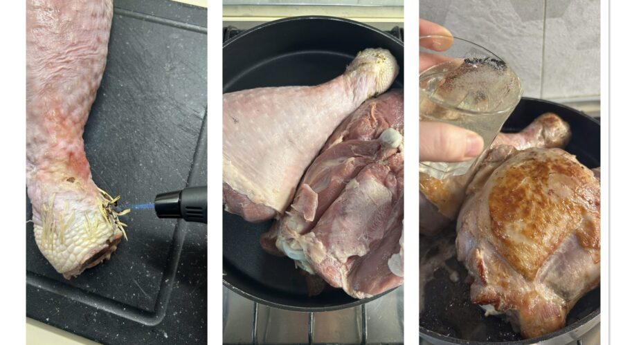 Bevor ihr beginnt, die eventuellen restlichen Federn am Herd oder mit einem Flambierbrenner abflämmen. Das Fleisch in die Pfanne geben und rundherum gut anbraten, dabei häufig wenden. Dieser Schritt dauert etwa 15 Minuten; das Fleisch sollte gleichmäßig goldbraun sein. Den Weißwein zugießen und verdampfen lassen.