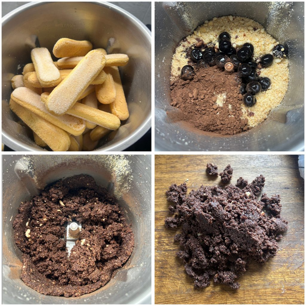 • In der Zwischenzeit bereitet ihr die Füllung zu: Zerkleinert die übrig gebliebenen Kekse aus der Vorratskammer oder den Biskuitboden im Mixer, gebt Konfitüre, Amarenen, Haselnussstückchen, Wein und Kakao dazu und mixt alles. Wenn ihr statt trockener Kekse frischen Biskuit verwendet, reduziert etwas die feuchten Zutaten wie Konfitüre, Amarenen oder Wein. Gebt die Masse auf die Arbeitsfläche, drückt sie zusammen und formt sie