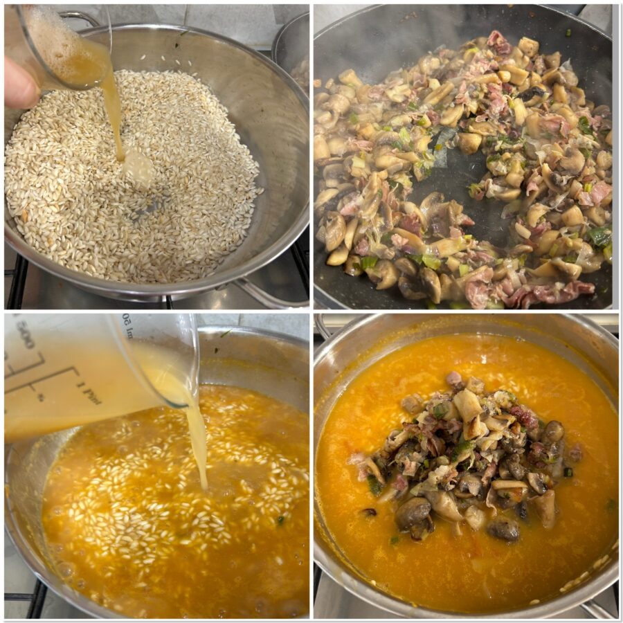 Zubereitung des cremigen Risottos mit Pilzen und Speck