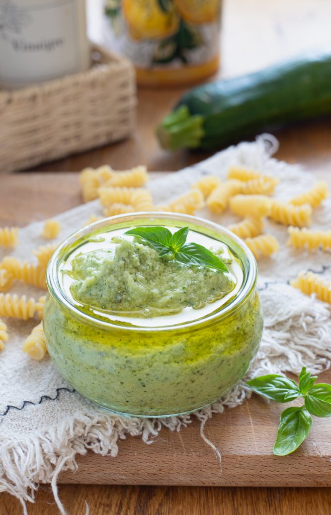 Verwendet für dieses Rezept möglichst frisch geerntetes Basilikum und sehr frische, zarte Zucchini – am besten aus biologischem Anbau; das Ergebnis wird hervorragend. Ich empfehle außerdem, die Zucchini vor der Verwendung gut im Kühlschrank zu kühlen; so verhindert ihr, dass das Pesto durch Wärme oxidiert.