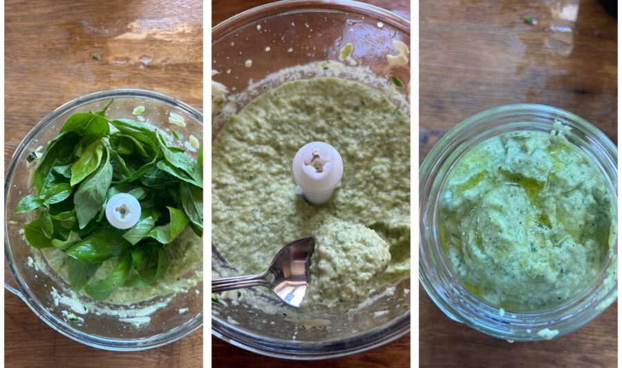 Spült das Basilikum kurz in kaltem Wasser, lasst es abtropfen und legt es auf ein Küchentuch. Die Zucchini abspülen, die Enden entfernen und trocken tupfen. Gebt die leicht in der Pfanne gerösteten Mandeln, die in Stücke geschnittene Zucchini, den Grana, den Pecorino, Salz, die geschälte Knoblauchzehe und das Öl in den Mixer und püriert alles gut, ohne die Masse zu erwärmen.