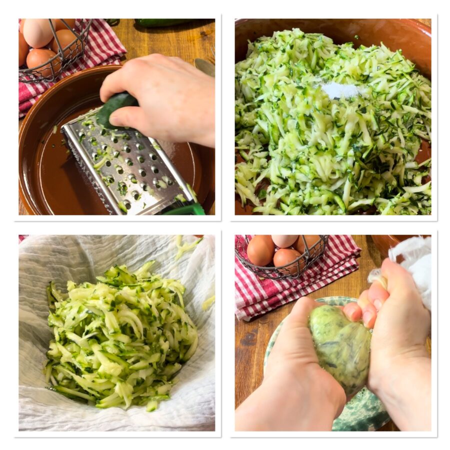 • Die Zucchini waschen, die Enden entfernen und mit einer Raspel mit groben Löchern direkt in eine Schüssel reiben.