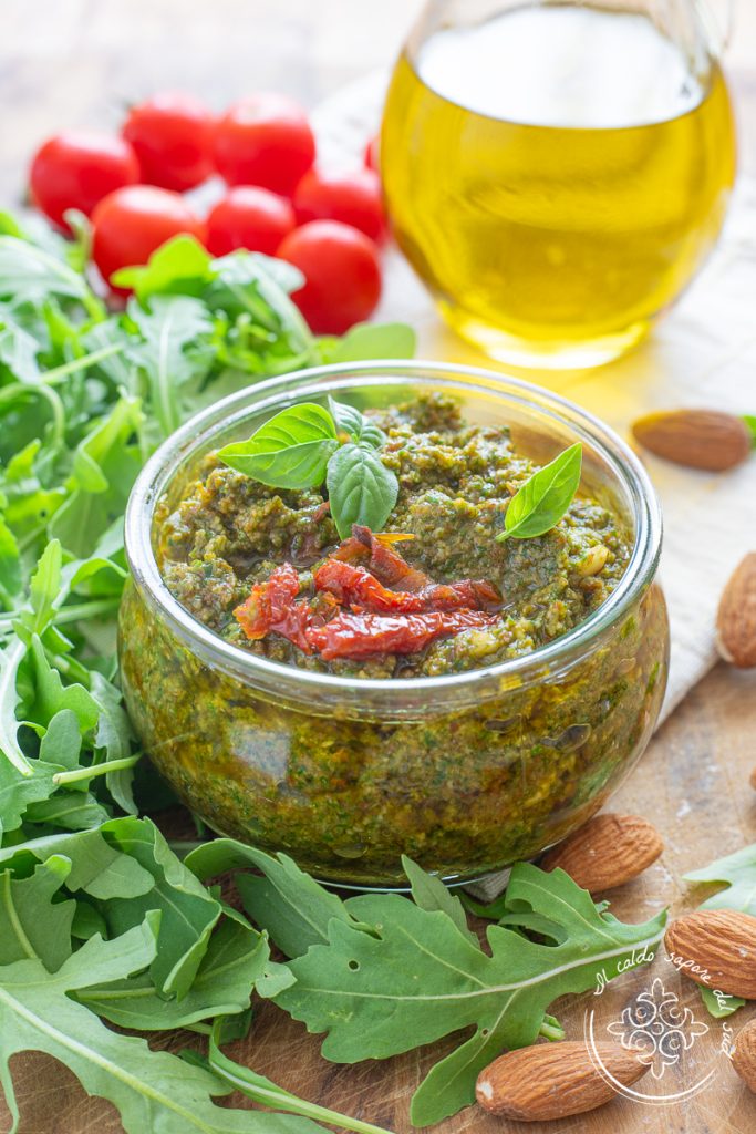 Rucola-Pesto mit getrockneten Tomaten, Omas Rezept. Das traditionelle Pesto alla Genovese ist einzigartig und unverwechselbar, aber es gibt viele Zubereitungen, die davon inspiriert sind und ebenso gute Würzsoßen ergeben. In all den Jahren haben wir viele hausgemachte Pesto-Rezepte ausprobiert, und wir haben bereits das Rucola-Mandel-Pesto gemacht, aber ein Rucola- und getrocknetes-Tomaten-Pesto fehlte uns noch — heute haben wir Abhilfe geschaffen! Das Rucola-Pesto mit getrockneten Tomaten, wie das Basilikum-Zitronen-Pesto oder das Basilikum-Walnuss-Pesto, ist eine sehr reichhaltige Sauce, die sich während des Pasta-Kochens zubereiten lässt und ein Rezept für schnelle und preiswerte erste Gänge darstellt, das allen am Tisch schmecken wird. Lecker, aromatisch und herrlich: Dieses Pesto, wie das sizilianische Pesto aus getrockneten Tomaten, ermöglicht es uns, eine Pasta zu servieren, die alle begeistert, und eine Sauce, die man auch gerne auf Pizza, Focacce, Brot und Bruschette zu genießen oder sogar direkt mit dem Löffel! Jetzt aber ab in die Küche: unsere Pasta mit Rucola-Pesto und getrockneten Tomaten, mit oder ohne Thermomix, wird euch überraschen. Bevor wir jedoch loslegen, erinnere ich euch daran, dass ihr, wenn ihr über neue Rezepte informiert bleiben wollt, meine Seite auf Facebook und mein Profil auf Instagram folgen könnt.
