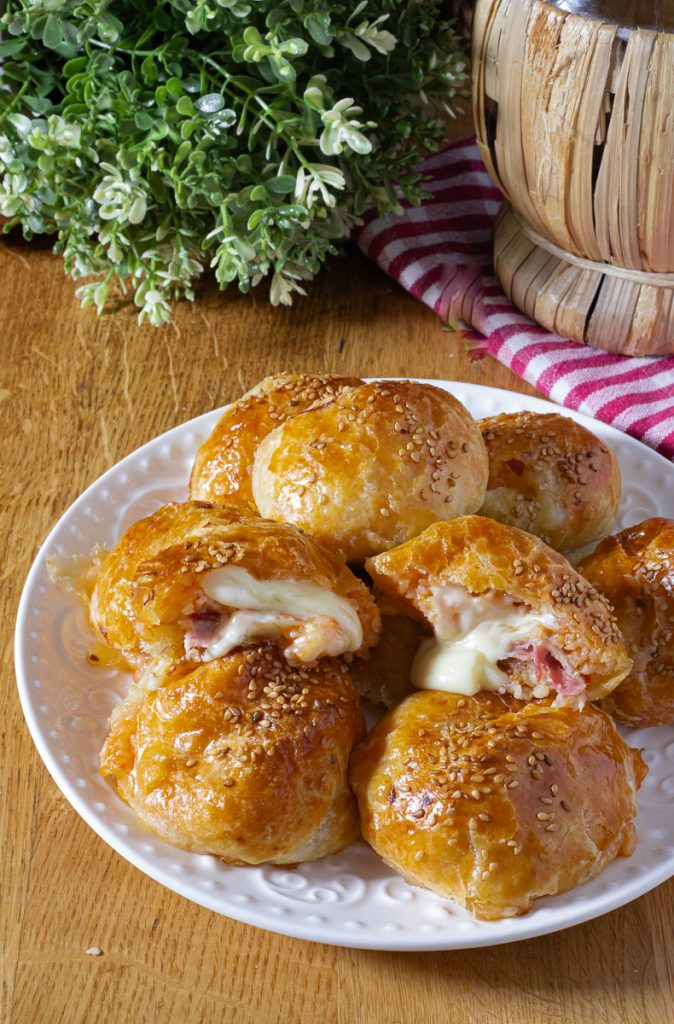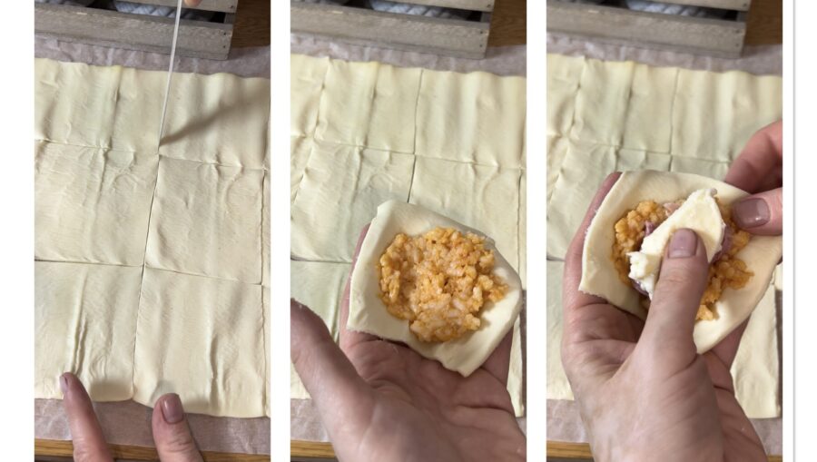 Rollt den Blätterteig aus und schneidet ihn in etwa 12 oder 9 Quadrate, je nach Länge und Breite des Teigs. Füllt sie mit dem kalten Risotto, einem Stück gekochtem Schinken und einem Stück Mozzarella und verschließt sie, indem ihr die Ränder an der Basis gut zusammendrückt.